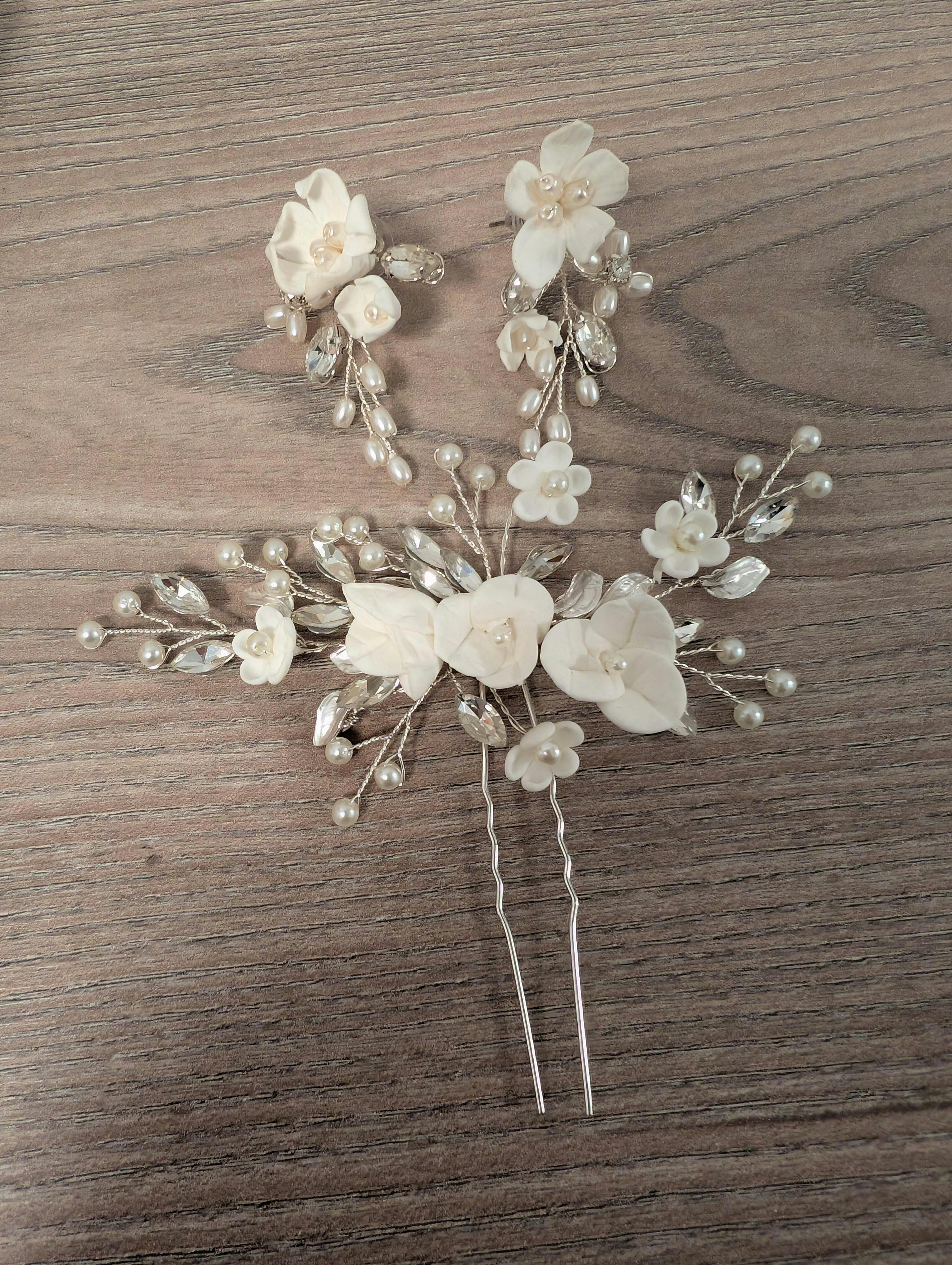 Braut Haarnadel, weiße Blüten, Perlen und silberner Strass, Brauthaarschmuck